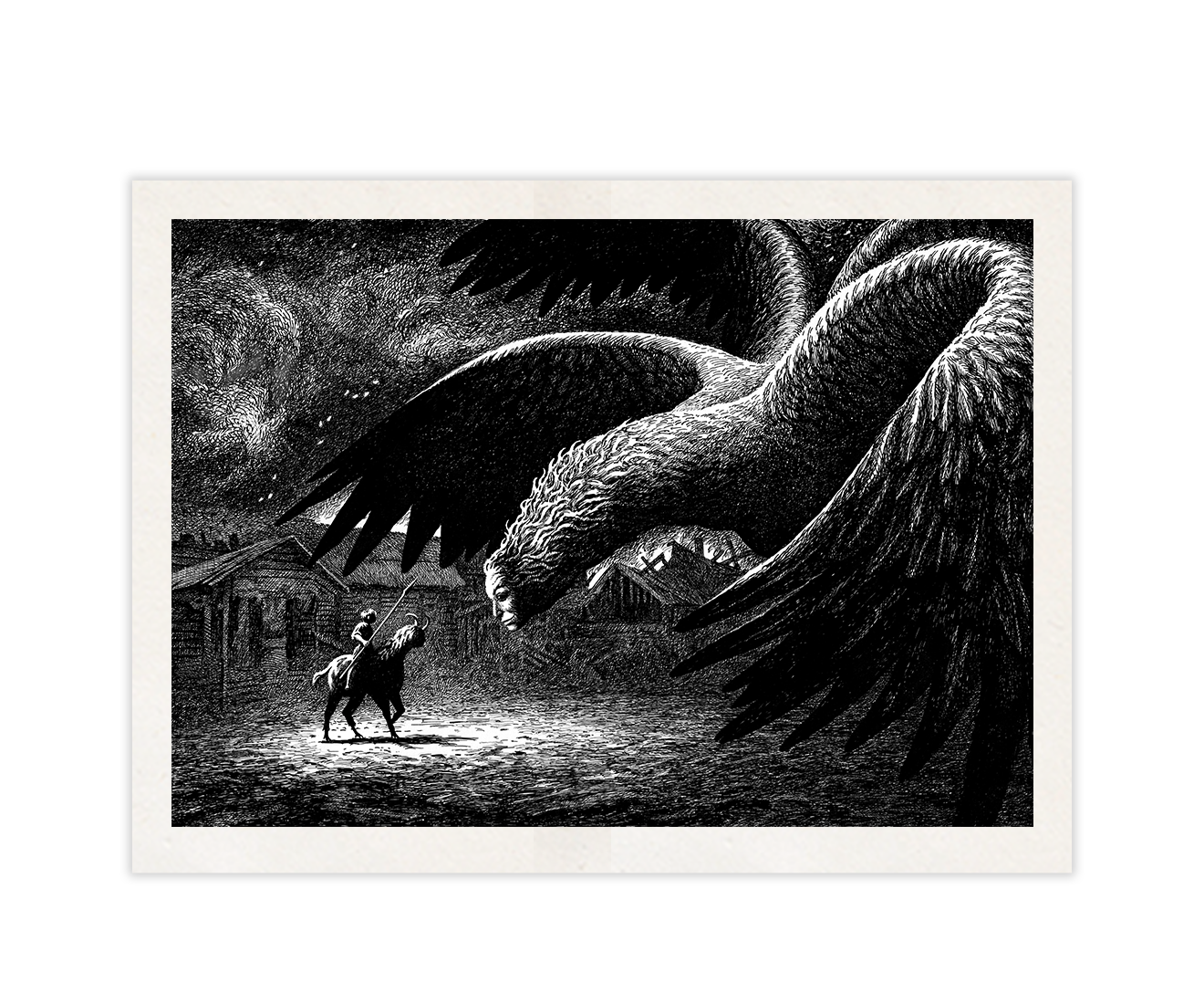 Tirage format A3 d'une illustration intitulée "La Dame plumeuse", réalisée par Tom Cuzor pour Le Chant des Monstres, un roman de Paul Hartzuri.